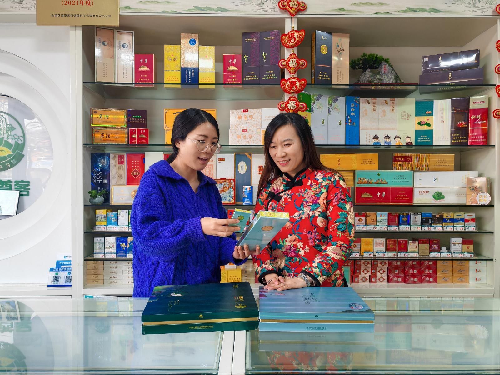 山東日照東港區(qū)煙草專賣局(分公司)近日緊抓旺季市場消費趨勢,圍繞經(jīng)營指導(dǎo)、終端提升、品牌推介等方面,著力為客戶提供增值服務(wù)、精準(zhǔn)服務(wù)和個性化服務(wù),助力零售客戶經(jīng)營“不降溫”。圖為營銷人員(左)正在向零售客戶介紹卷煙特點。