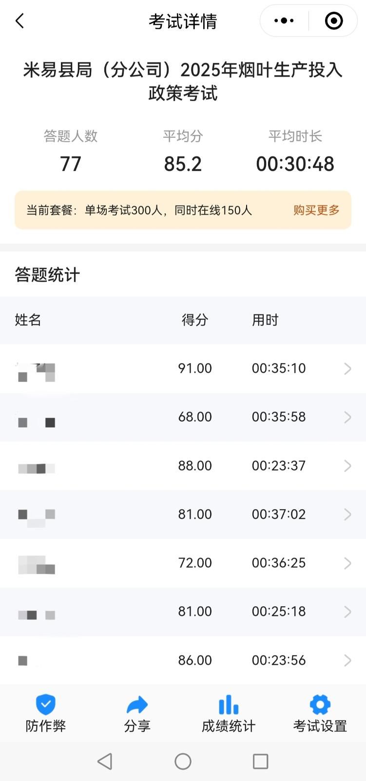 學(xué)習(xí)的最終目的是應(yīng)用,而考試則是檢驗(yàn)學(xué)習(xí)成效的關(guān)鍵環(huán)節(jié)。米易縣局(分公司)依托“考試寶”線上考試平臺(tái),借助基層站點(diǎn)視頻監(jiān)控,開展透明化、可視化的員工素能測(cè)評(píng),避免員工舟車勞頓,考試產(chǎn)生的差旅費(fèi)較2024年減少2.61萬元,切實(shí)踐行了“點(diǎn)滴行動(dòng)”。“手機(jī)考試太方便了!像傳統(tǒng)考試,要提前準(zhǔn)備場(chǎng)地、打印試卷,現(xiàn)在動(dòng)動(dòng)手指就能完成組卷、發(fā)布,員工隨時(shí)隨地都能考?!必?fù)責(zé)考試組織的煙葉科烘烤主管趙方德對(duì)筆者說道?!斑@種考試方式很高效、科學(xué),1次就減少了我往返縣公司的交通費(fèi)用90元?!蹦蠅螣燑c(diǎn)物資管理員鐘俊對(duì)新方式贊不絕口。