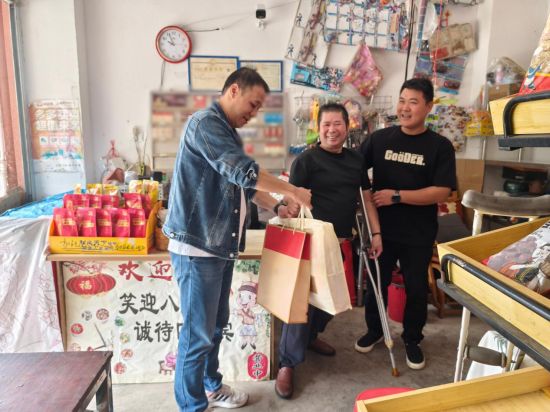 圖為尋烏縣煙草專賣局志愿者黃志剛、謝應瑞為殘疾戶送上關懷禮包