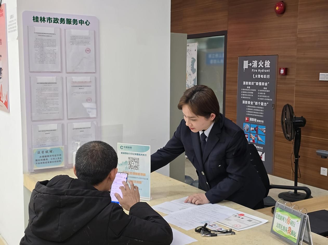 圖為桂林煙草工作人員指導(dǎo)辦證群眾使用“許可證前置服務(wù)系統(tǒng)”(趙怡若 攝)