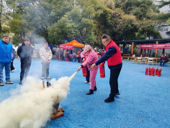 圖為志愿者在社區(qū)開展消防培訓,指導社區(qū)居民使用滅火器