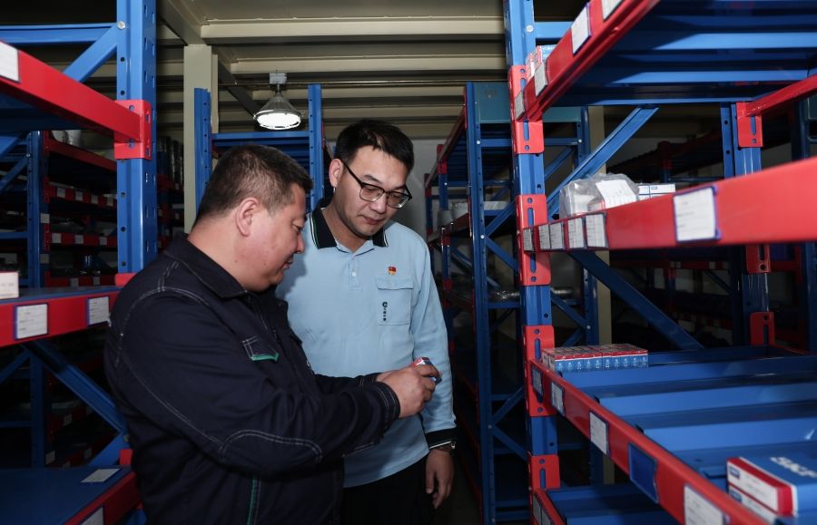 研發(fā)人員(右)與保管員在備件庫(kù)核實(shí)信息(11月18日攝)。孫雪飛 攝