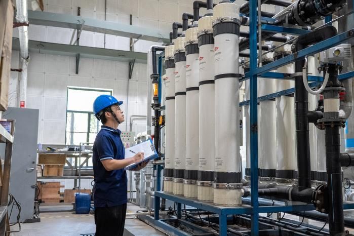 動力車間員工檢測回收水凈化系統(tǒng)工作狀況。楊成奧攝