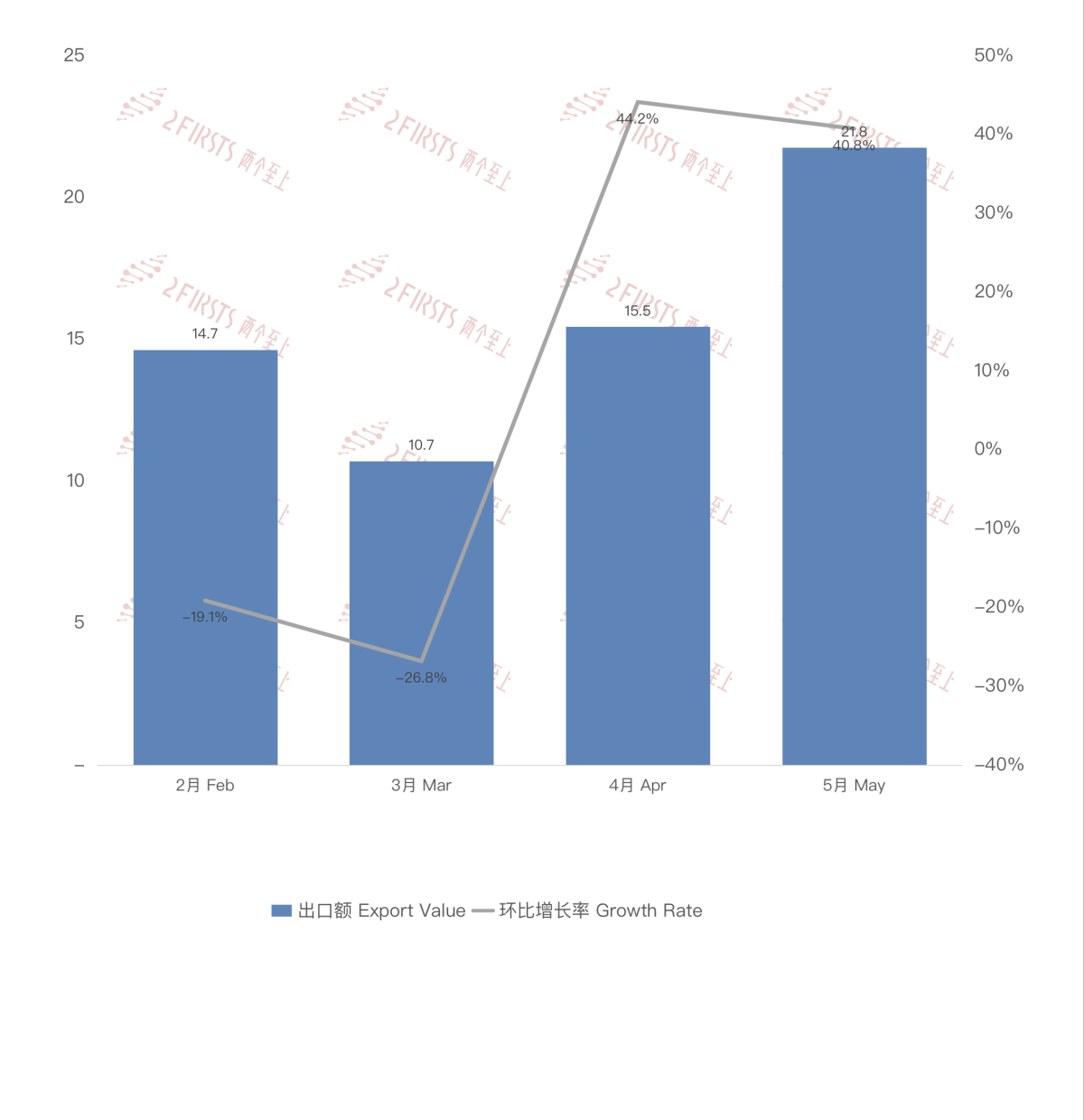 出口額約為2177萬(wàn)美元,環(huán)比增長(zhǎng)40.8 %,同比增長(zhǎng)14.4%。
