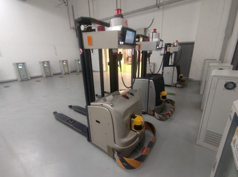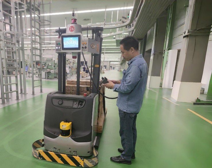 圖為維修工現(xiàn)場解決AGV小車故障。
