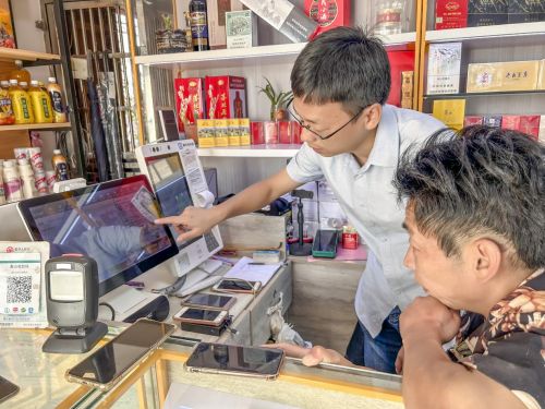 圖為煙草公司客戶經(jīng)理詳細(xì)指導(dǎo)方建生使用“香溢通”店鋪管理軟件