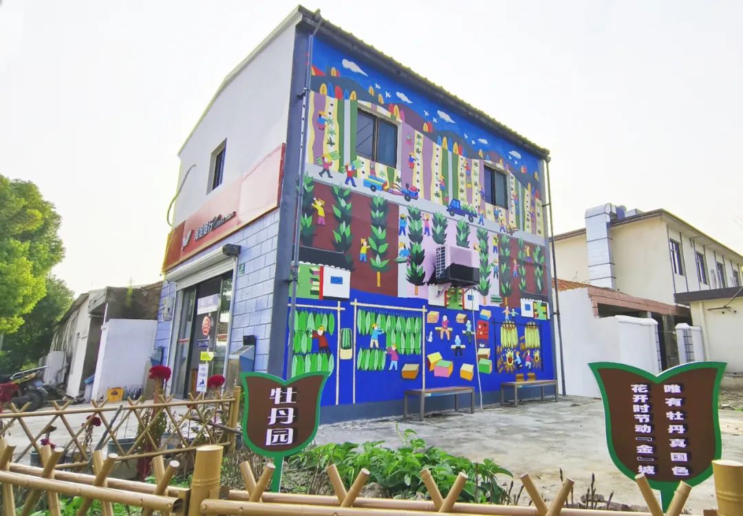 外立面墻上,巨幅農民畫描繪著現代煙草農業(yè)場景;墻角花圃里,株株牡丹向陽綻放……金山區(qū)呂巷鎮(zhèn)薔薇村村頭,阿秀食品店吸引了不少路人駐足觀賞、拍照打卡。