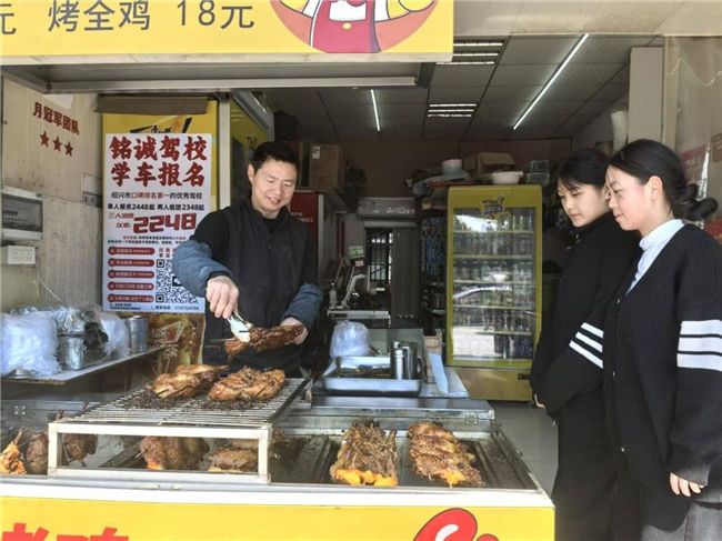 清晨六點半,浙江紹興馬山街道的梧桐樹影剛被晨光染成金色,吳建豐的“樂客多便利店”已飄出第一縷熏香,此刻滋滋作響的烤雞在晨霧中氤氳出誘人香氣。