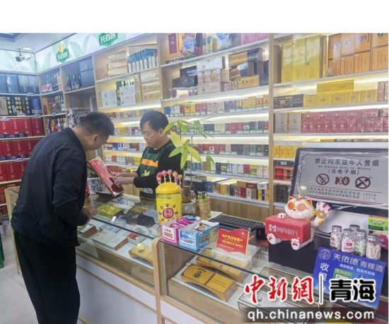 圖為海北州海晏縣局加盟零售終端店店主向消費(fèi)者介紹卷煙鑒別知識(shí)。連東鋒 攝