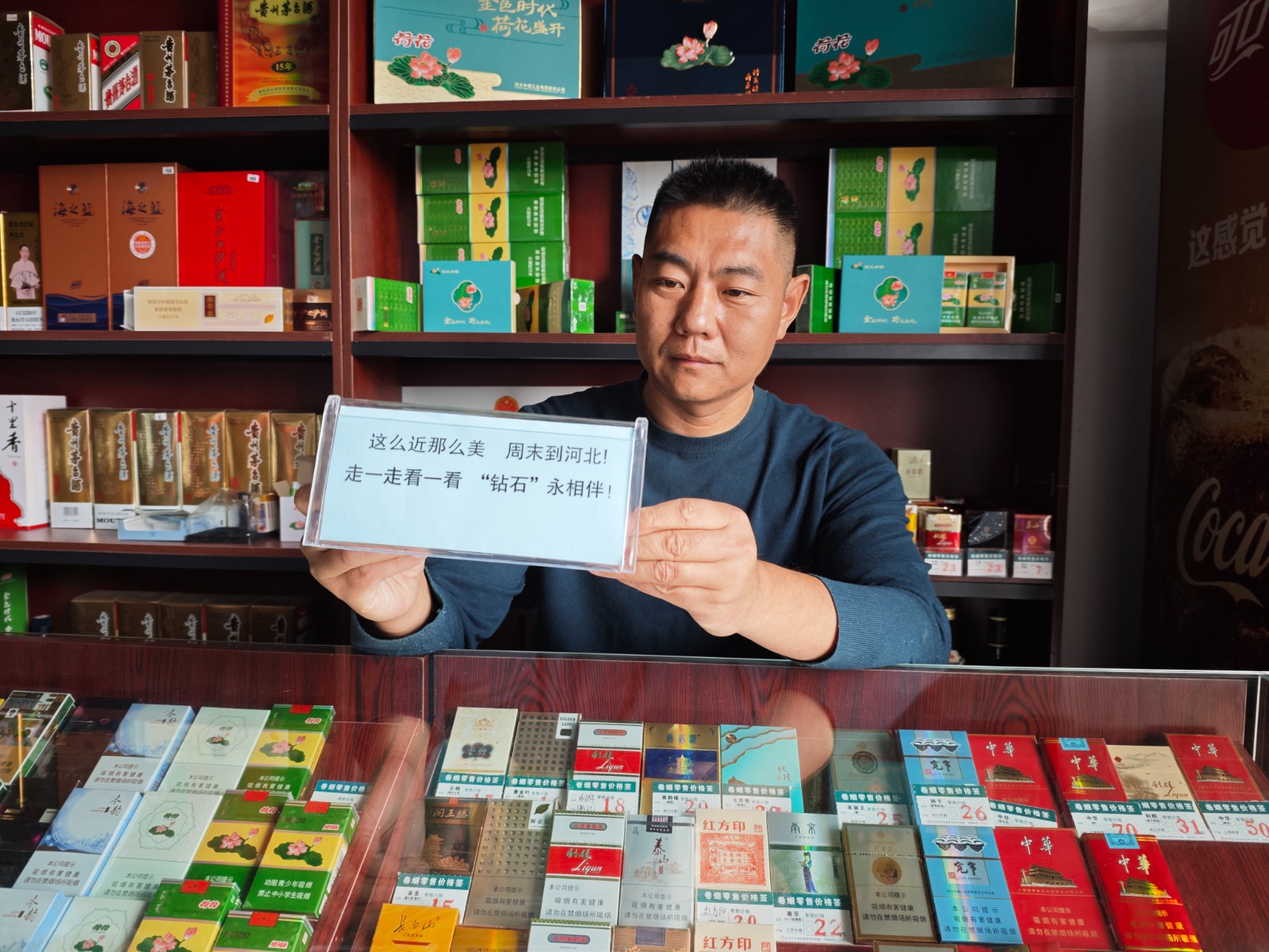 超市緊鄰雜技大世界景區(qū)入口,地理位置得天獨(dú)厚,但吳新建從不止步于“靠位置賺錢”。他把門口最大的空間留給了煙柜,玻璃柜面一塵不染,香煙按品牌、價位整齊陳列,尤其是河北地產(chǎn)的“鉆石”系列禮盒,被放在最顯眼的位置,方便游客挑選。“來吳橋玩的游客,不少想帶點(diǎn)本地特色煙回去,我得把咱們的地產(chǎn)煙好好推一推?!?/p>