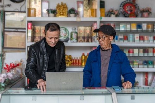 (圖為客戶經(jīng)理現(xiàn)場(chǎng)指導(dǎo)商品掃碼銷售)