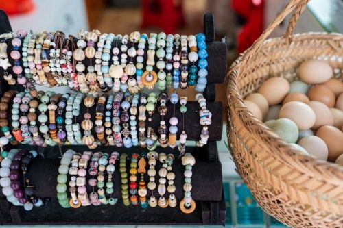 (圖為店內(nèi)銷售的陶瓷手串和本地土雞蛋)