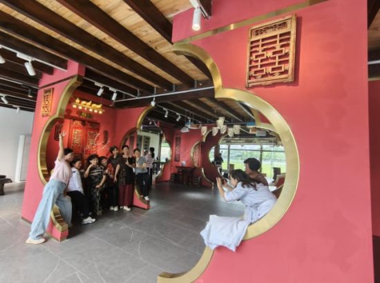 圖為各地游客在梅湖景區(qū)甜蜜經(jīng)濟“網(wǎng)紅領(lǐng)證廳”內(nèi)拍照打卡。應(yīng)浩攝