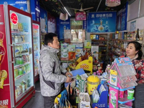 圖為客戶經(jīng)理認(rèn)真與零售戶商討如何調(diào)整商品陳列,升級終端。余裕承攝