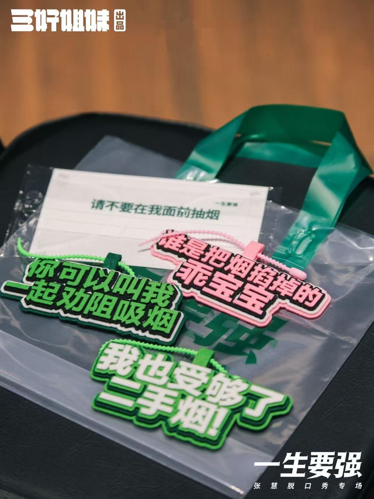 此次專場的一大亮點(diǎn),是與中國青年網(wǎng)聯(lián)手打造的控?zé)煿姝h(huán)節(jié)。張慧團(tuán)隊(duì)為專場定制了印制勸阻吸煙標(biāo)語的毛氈掛件、禁煙主題口罩周邊。中國青年網(wǎng)定制的主題收納袋則印著控?zé)煒?biāo)語,“拒絕二手煙霸凌”,“呼吸權(quán),我的基本款”,“勸阻吸煙,你不是一個(gè)人”等等,引發(fā)很多觀眾當(dāng)場熱烈討論起來。
