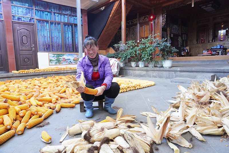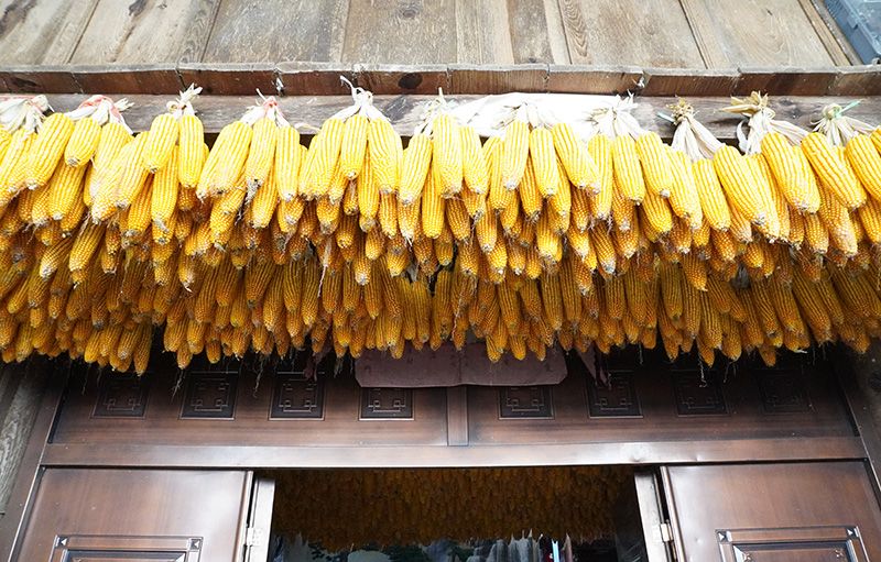走進(jìn)黃素英的家里,一串串金燦燦的玉米掛在門頭上、鋪在院里、排在臺階旁,黃澄澄的暖意瞬間驅(qū)走了寒冬清晨的涼意。