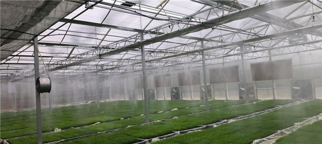 育苗大棚噴淋系統(tǒng)噴頭啟動(dòng)噴霧效果圖 ?張佳華攝