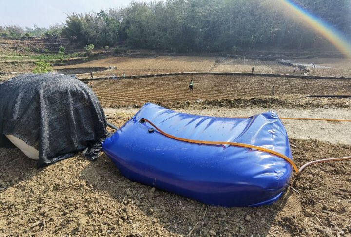這些應急儲水袋有密閉式即臥式、敞開式即立式之分,農戶可以通過抽水泵把水池、壩塘、小水窖源頭的水源靈活快速輸送至田間地頭的一個個儲水袋,堪稱田間地頭自壓式“水泵站”,充分利用地形所形成的自然壓差,借助低壓管道系統(tǒng),不需要消耗電能就可進行人工滴灌、滲灌等節(jié)水灌溉,緩解作物季節(jié)性干旱問題,確保農作物高產穩(wěn)產。