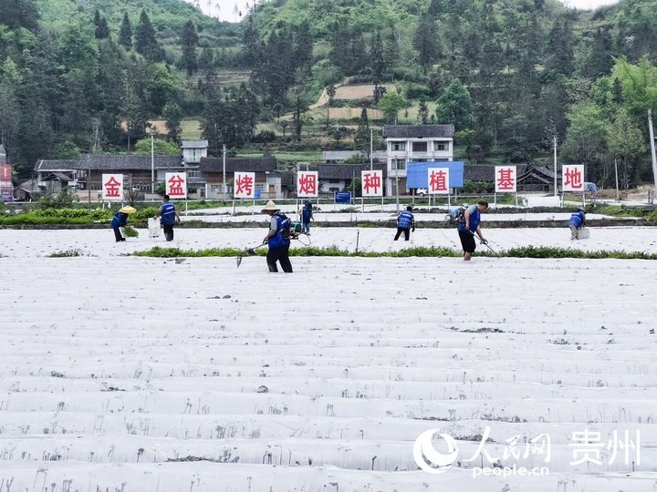 鎮(zhèn)遠(yuǎn)縣金盆烤煙種植基地內(nèi),煙農(nóng)們正忙著移栽煙苗。人民網(wǎng)記者 王秀芳攝