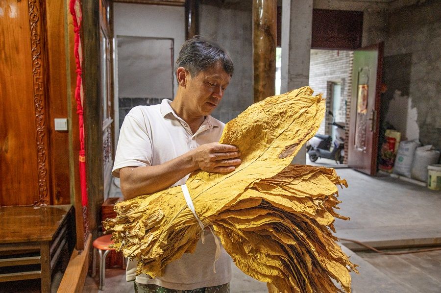 葉升蒼在查看烤干的煙葉(8月14日攝)。