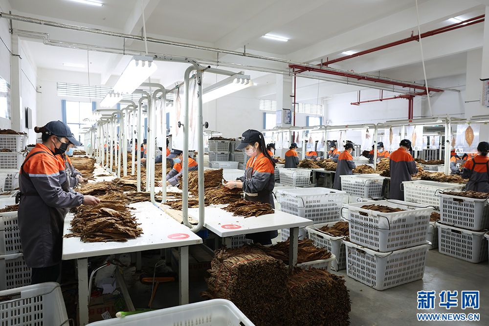 圖為湖北恩施來鳳雪茄煙發(fā)酵工廠工作人員對(duì)雪茄煙葉進(jìn)行分揀、評(píng)級(jí)。新華網(wǎng)發(fā)