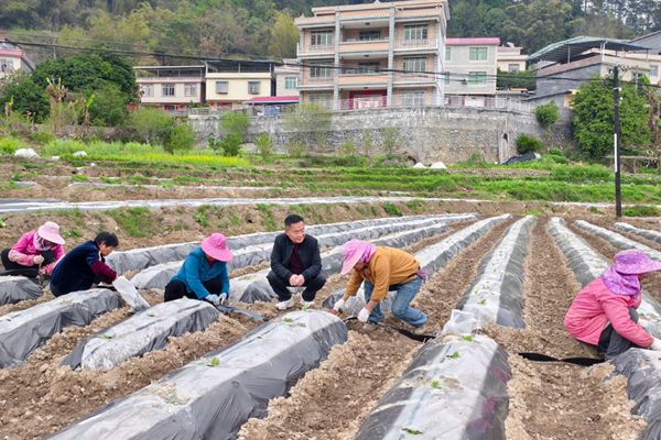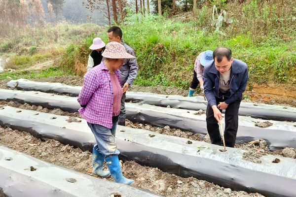 煙技員正在指導(dǎo)煙農(nóng)進(jìn)行膜上移栽。楊紹基攝