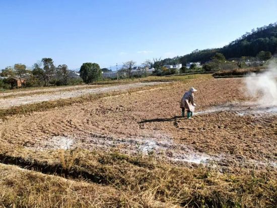 圖為高田鎮(zhèn)田心村煙農(nóng)正在撒施石灰,改良土壤