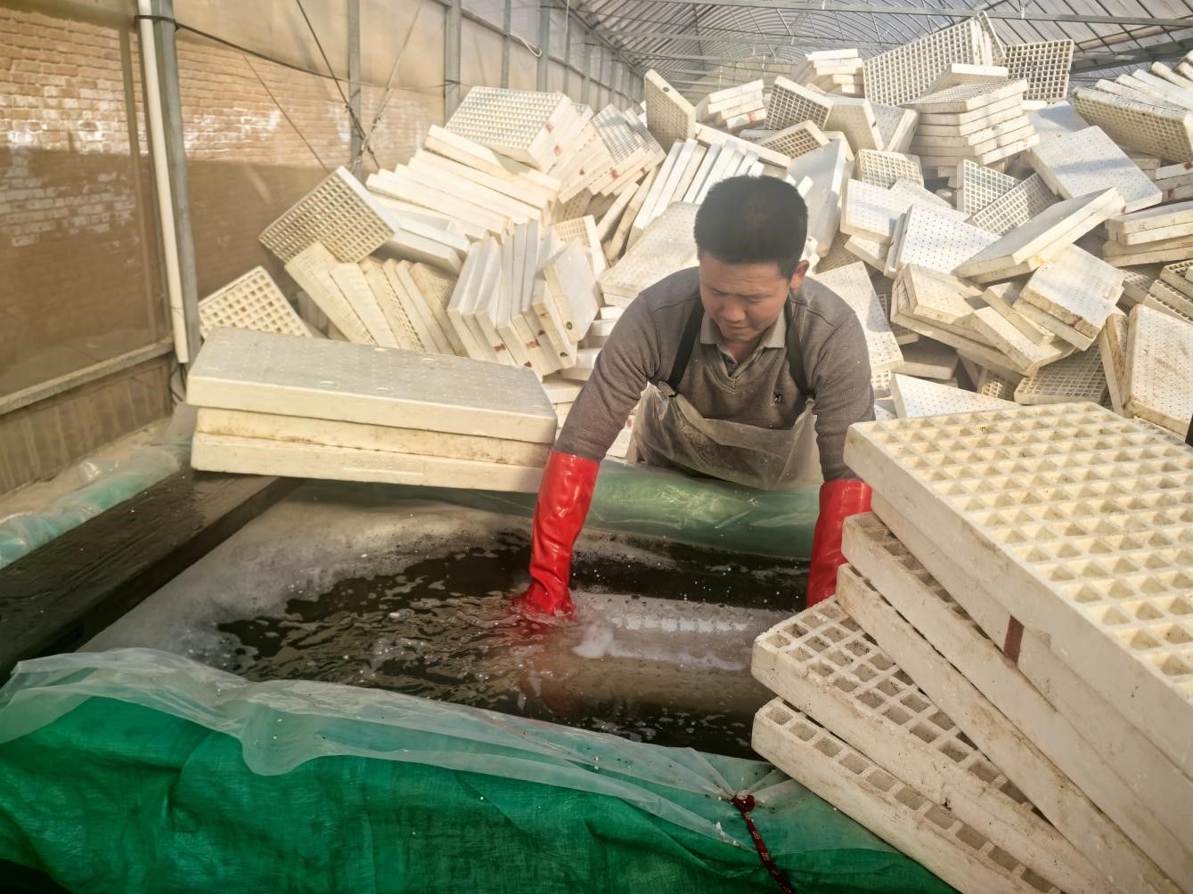 育苗格盤(pán)消毒作業(yè)。壽紀(jì)培攝