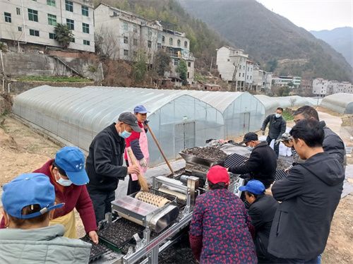 走進(jìn)漢濱區(qū)茨溝鎮(zhèn)茨口村育苗點(diǎn),18個(gè)修繕一新、寬敞明亮的育苗大棚一字兒排列,整齊坐落于田野間。育苗棚外,人頭攢動,堆積如山的基質(zhì)格外顯眼,一臺機(jī)械化播種機(jī)運(yùn)轉(zhuǎn)起來,各類育苗設(shè)施準(zhǔn)備到位。只見新禾豐合作社的工人們在技術(shù)人員現(xiàn)場操作示范后,忙碌地進(jìn)行基質(zhì)裝盤、播種,隨后又將一盤盤已點(diǎn)播好種子的苗盤整齊排列并放入苗池,每個(gè)環(huán)節(jié)都有條不紊地推進(jìn)。