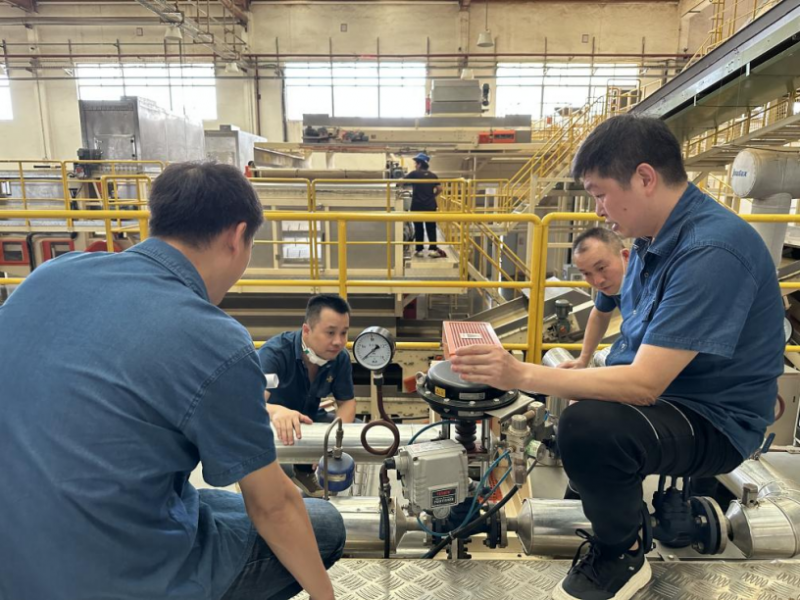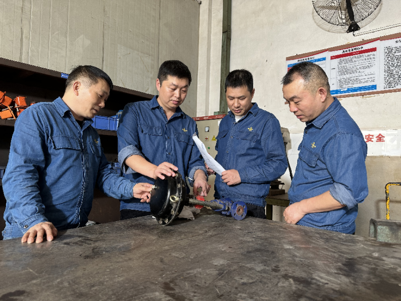 楊魁(左二)和團(tuán)隊(duì)研究探討氣動(dòng)薄膜閥