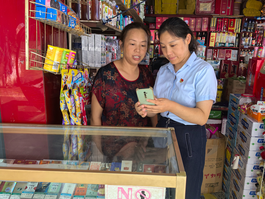 客戶經(jīng)理李小琴指導(dǎo)周易蘭查看店鋪盈利數(shù)據(jù)。資陽市煙草專賣局供圖