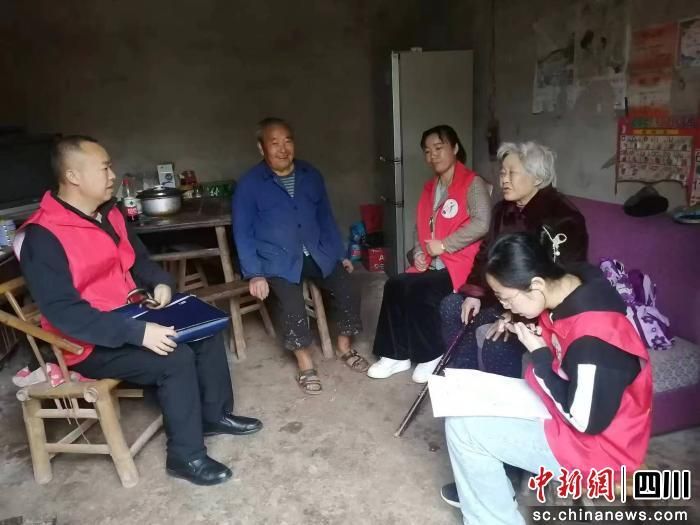 王明建(左一)與駐村工作隊(duì)員入戶調(diào)查基礎(chǔ)情況。內(nèi)江市煙草專賣局供圖