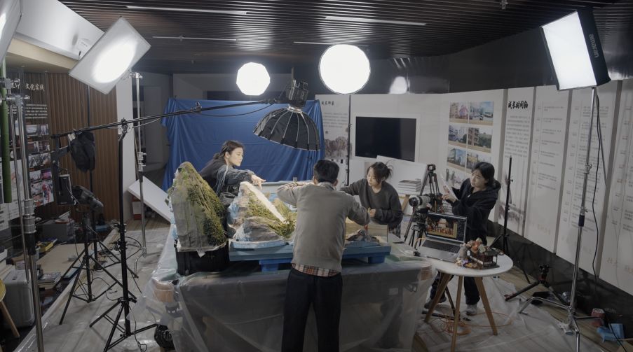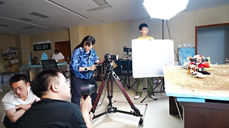劉景(右一)及團(tuán)隊(duì)拍攝保護(hù)未成年人成長(zhǎng)主題定格動(dòng)畫。
