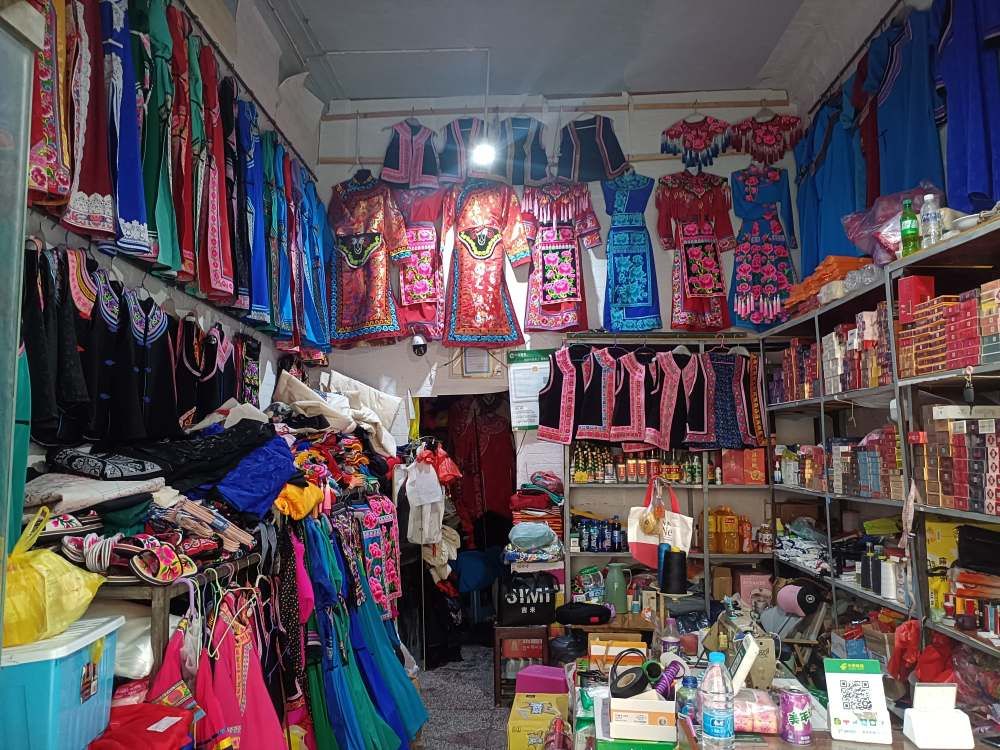 趙國芝的店鋪里掛滿了藏羌服飾。汶川縣煙草公司供圖