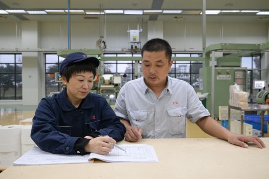 圖為占靜紅(左)和擋車工一起分析產(chǎn)品材料使用情況