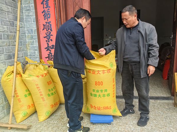 黃家海(左)和煙農了解煙后水稻收成情況。楊紹基攝