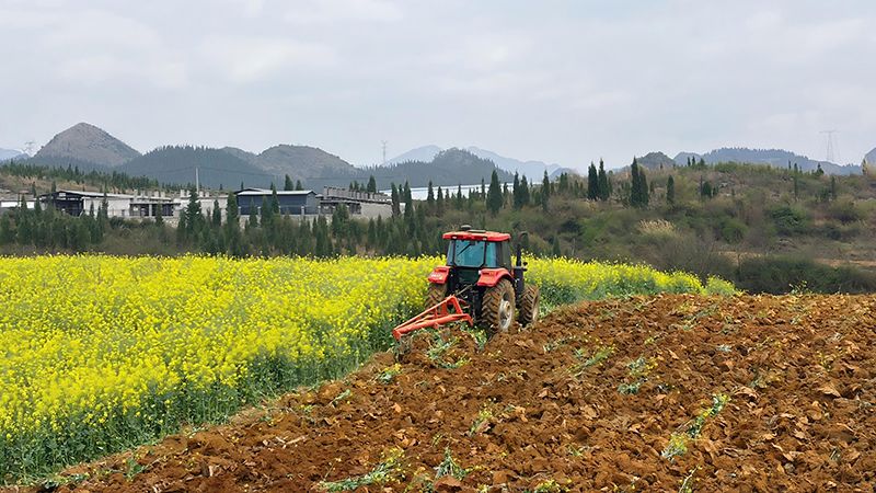 春節(jié)剛過,貴州省興仁市屯腳鎮(zhèn)的田野上已是一派忙碌。致遠(yuǎn)機(jī)械收獲農(nóng)民專業(yè)合作社的機(jī)庫里,姚呈遠(yuǎn)正穿梭在整齊排列的農(nóng)機(jī)具之間,不時(shí)俯身檢查履帶、敲敲輪胎。不遠(yuǎn)處,一臺(tái)大型拖拉機(jī)正轟鳴著來回作業(yè),犁鏵深深扎進(jìn)泥土,將油菜花連同土塊一起翻卷起來,在空中飛旋、混合后又齊齊整整地壓進(jìn)土壤里——這一趟過去,土地就準(zhǔn)備好了迎接新一年的耕耘。