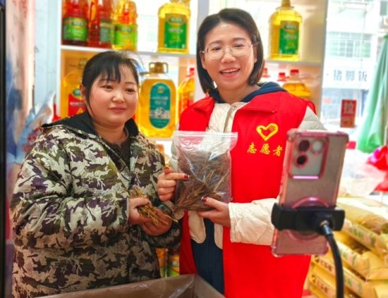 圖為幫扶隊員與村民開展山貨助農(nóng)直播