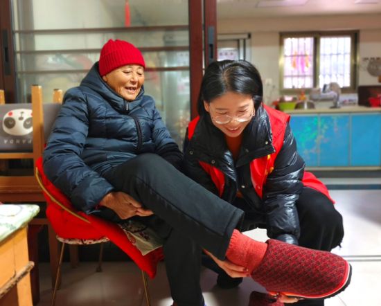 圖為幫扶隊員給村里空巢老人送手工棉鞋
