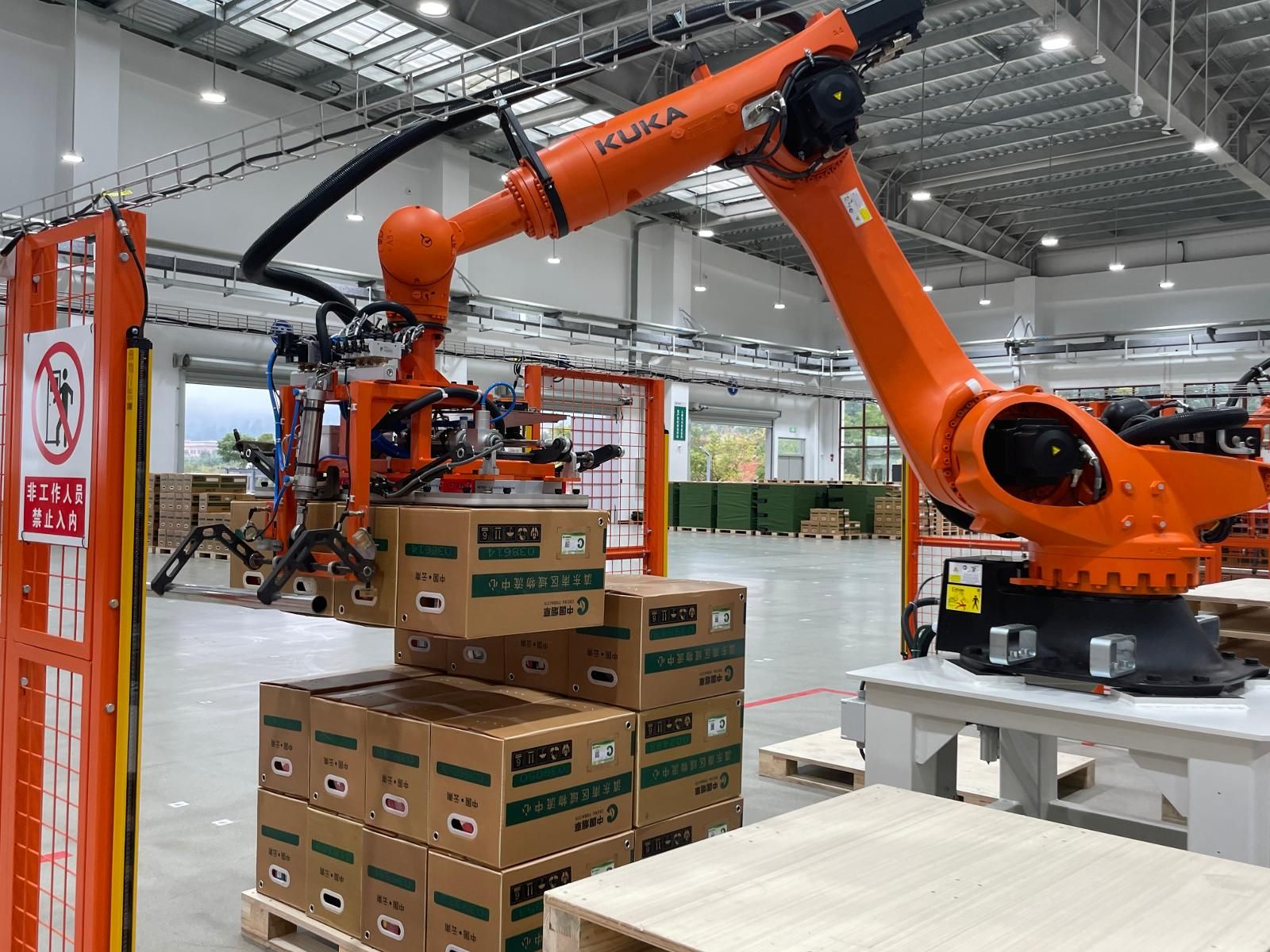 完成碼垛后,軟塑箱將由AGV小車運至發(fā)貨暫存區(qū)等待配送。顧潤君攝