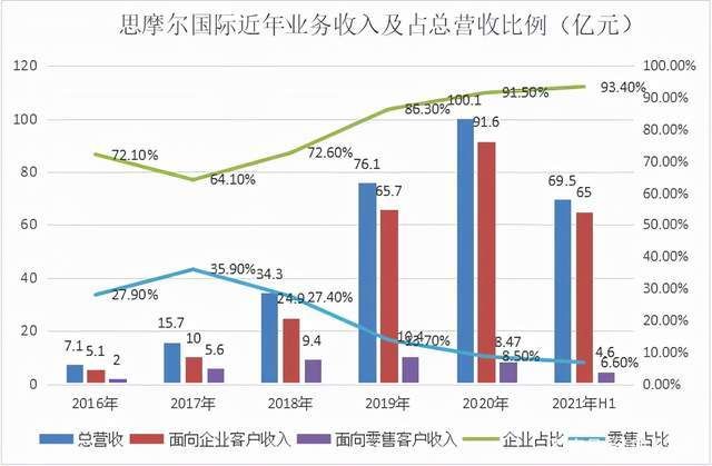 拉長(zhǎng)時(shí)間線來(lái)看,2016年至2020年,思摩爾國(guó)際面向企業(yè)客戶(hù)的銷(xiāo)售金額分別為5.1億元、10億元、24.9億元、65.7億元、91.6億元,占總營(yíng)收的比例分別為72.1%、64.1%、72.6%、86.3%、91.5%;相對(duì)應(yīng)的面向零售客戶(hù)的銷(xiāo)售金額分別為2億元、5.6億元、9.4億元、10.4億元、8.47億元,占總營(yíng)收的比重分別為27.9%、35.9%、27.4%、13.7%,8.5%。