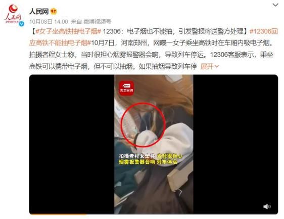 12306回應(yīng)稱(chēng),高鐵上可以攜帶電子煙,但不能抽,一旦觸發(fā)煙霧報(bào)警,造成列車(chē)速度減慢,或緊急制動(dòng)停車(chē),乘客有可能會(huì)遭到行政拘留,情節(jié)嚴(yán)重的還需要承擔(dān)刑事責(zé)任。