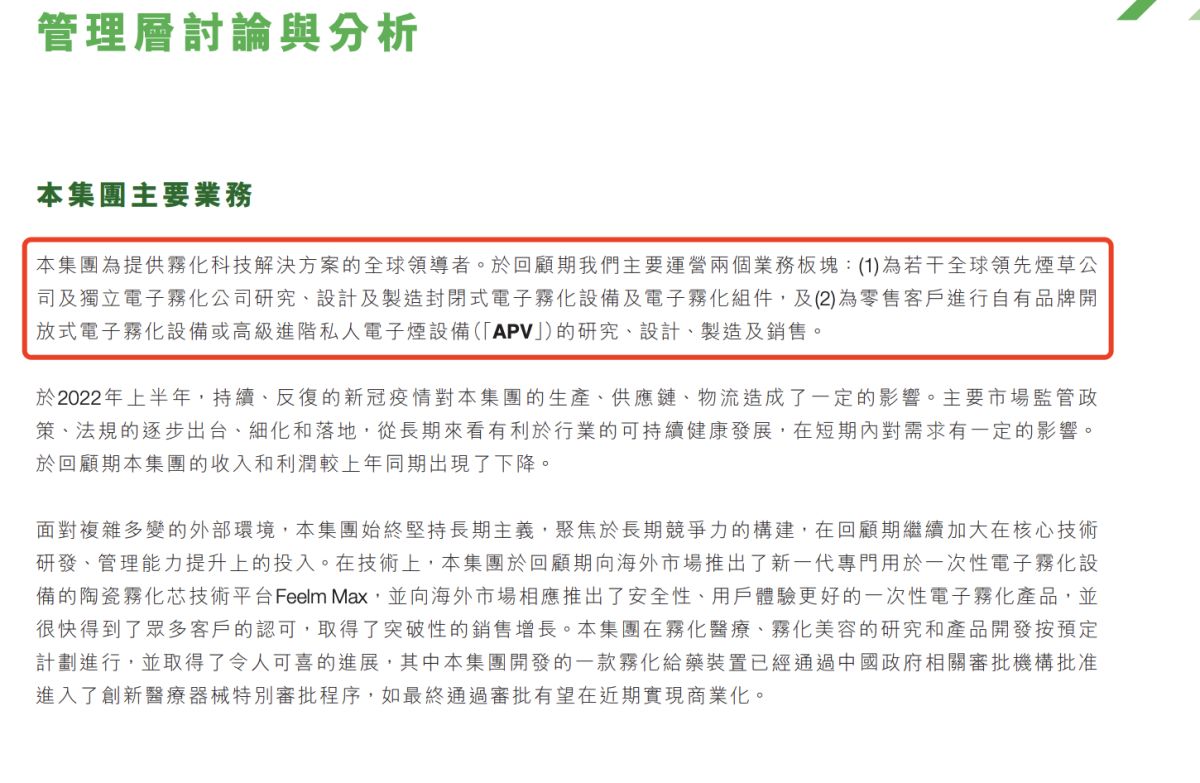 對比2022年中期報(bào)告與2022年年報(bào),2022年年報(bào)首次將主要業(yè)務(wù)從兩部分?jǐn)U展到三部分,在“(1)為若干全球領(lǐng)先煙草公司、獨(dú)立電子霧化及其他企業(yè)客戶研究、設(shè)計(jì)及制造封閉式電子霧化設(shè)備、電子霧化組件、加熱不燃燒設(shè)備及組件及特殊用途霧化產(chǎn)品,及(2)為零售客戶研究、設(shè)計(jì)、制造及銷售開放式電子霧化設(shè)備或高級進(jìn)階私人電子煙設(shè)備(「APV」)”的基礎(chǔ)上,新增“以霧化技術(shù)為基礎(chǔ),為患者提供吸入式給藥產(chǎn)品的霧化醫(yī)療等新業(yè)務(wù)”等內(nèi)容。