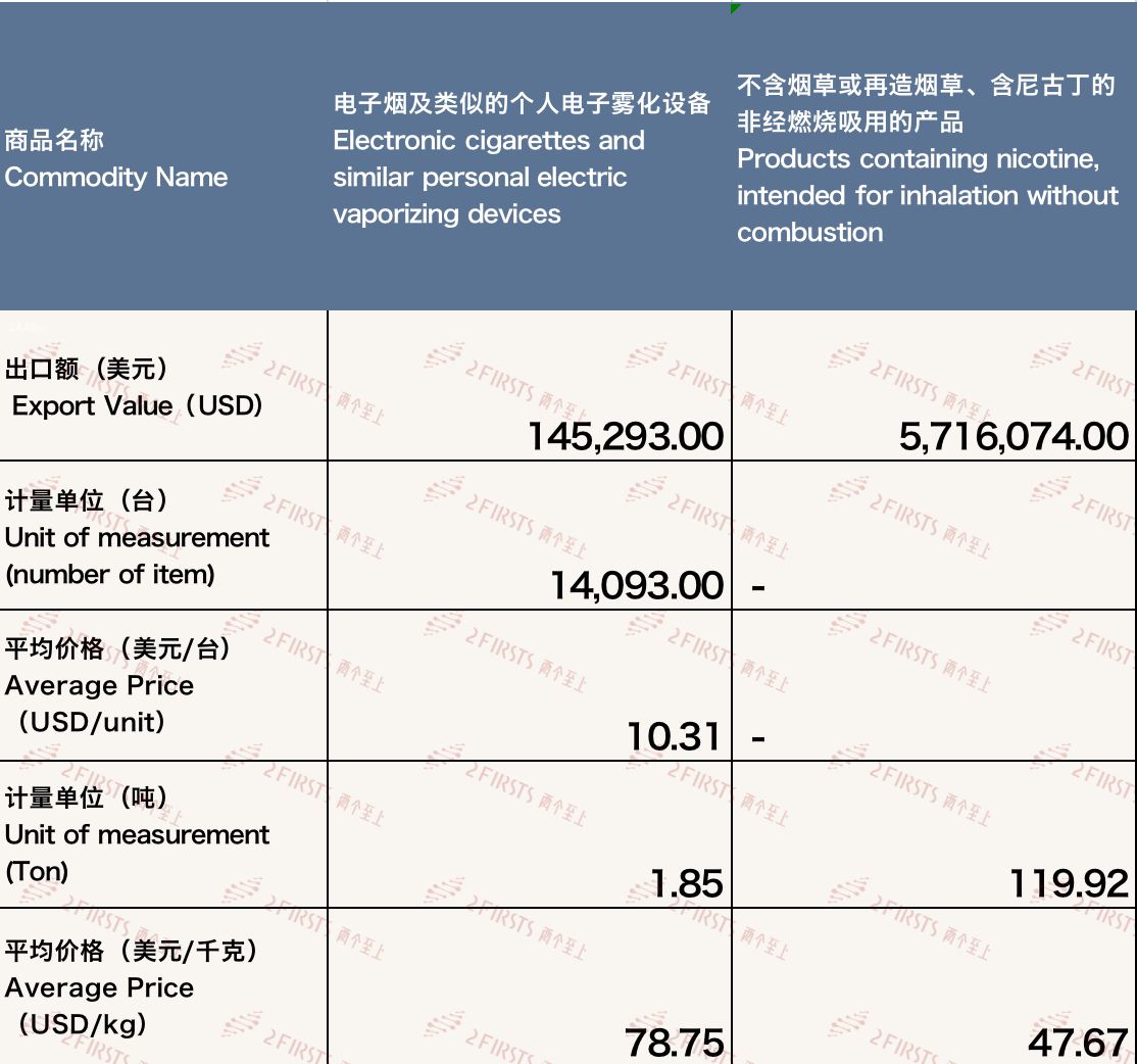 其中,“電子煙及類似的個(gè)人電子霧化設(shè)備”占出口品類的2.48%,而“不含煙草或再造煙草、含尼古丁的非經(jīng)燃燒吸用的產(chǎn)品”占比97.52%。