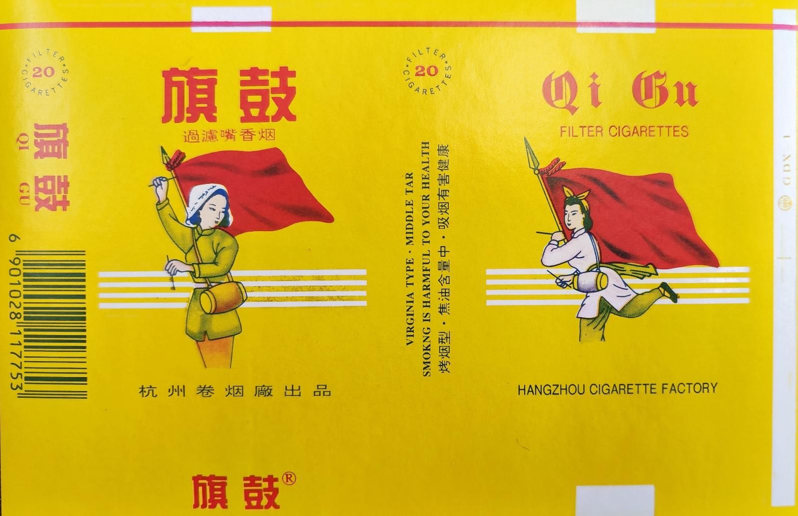 上世紀(jì)六十年代,杭州卷煙廠和寧波卷煙廠共同生產(chǎn)了“旗鼓”品牌,“旗鼓”煙標(biāo)也就應(yīng)運(yùn)而生。該枚煙標(biāo)以黃色為底色,主版圖案是一個扛著旗子的農(nóng)家婦女敲擊著腰鼓,副版圖案一個別著腰鼓揮舞著旗子的農(nóng)家婦女,這兩幅圖案恰是“舞旗”“敲鼓”的真實(shí)寫照。