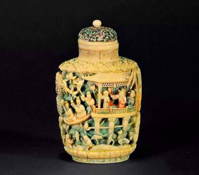 此鼻煙壺,壺身整體滿雕不露地,為一幅采蓮圖,雕刻極細,刀法多樣,浮雕、鏤雕兼具,人物眉眼衣紋歷歷可辨,房屋、樹葉處的鏤雕使畫面充滿立體感。雖然壺身滿布圖案,但疏密得當,絲毫不顯繁亂。牙雕原有染色,但已有脫落,斑駁中更顯古意。整個畫面淡雅,景色人物相輔相成,在雕刻出輕快活潑的采蓮情景的同時,還透出淺淺的愁緒。