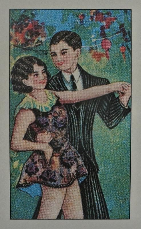 交誼舞又稱交際舞,是起源于西方的社交舞蹈,在古老民間舞蹈的基礎(chǔ)上發(fā)展演變而成。自16世紀(jì)起,交誼舞在各國成為一種普遍的社交活動,有“世界語言”之稱。20世紀(jì)20年代以后,交誼舞在世界各地風(fēng)行起來,所以它被稱為“國際舞”。上世紀(jì)30年代,上海瑞倫煙公司出品過“交際舞”煙畫,10枚一套,描繪了男女成對跳交際舞的場景。其中一枚描繪了一對在跳舞的人,身穿西裝的男子左手握著舞伴的手、右手臂挽住舞伴的腰,女子身穿短裙、右手叉腰,姿勢優(yōu)美。