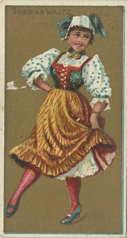 華爾茲,又稱圓舞曲,是一種非常受歡迎的自娛舞蹈形式。19世紀(jì)末,金尼兄弟煙公司出品過“民族舞蹈”煙畫,50枚一套,其中一枚為“華爾茲”。煙畫上一位女子身著民族服裝,右手叉腰,左手提裙,美麗的裙角上下翻飛,展現(xiàn)了華爾茲的魅力。