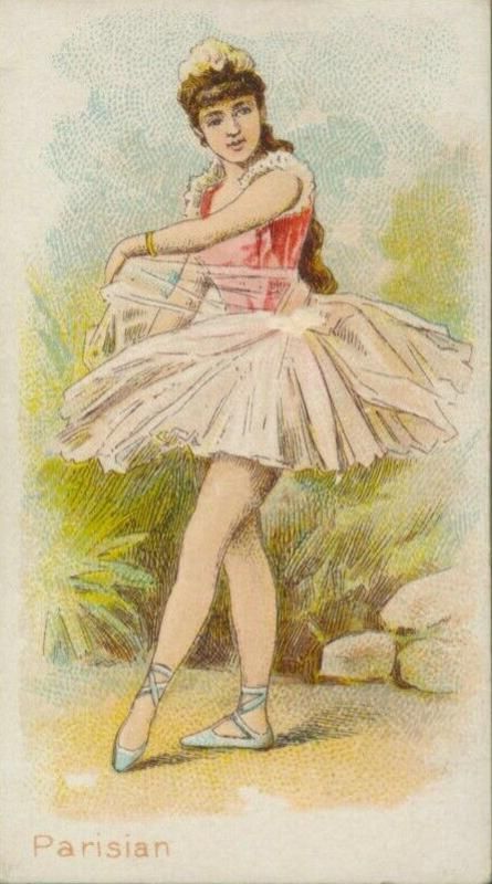 芭蕾舞是歐洲古典舞蹈,孕育于意大利文藝復(fù)興時期,17世紀(jì)后半葉開始在法國發(fā)展流行并逐漸職業(yè)化,在不斷革新中風(fēng)靡世界。芭蕾舞最重要的一個特征即演員表演時以腳尖點地,故又稱“腳尖舞”。19世紀(jì)末,金博爾煙公司出品過“跳舞女子”煙畫,50枚一套,其中一枚為“巴黎”。這枚煙畫描繪了一名芭蕾舞女孩穿著白色的蕾絲短裙,頭戴精致的頭冠,左腳尖輕輕點地,宛如湖面上一只優(yōu)雅的天鵝。