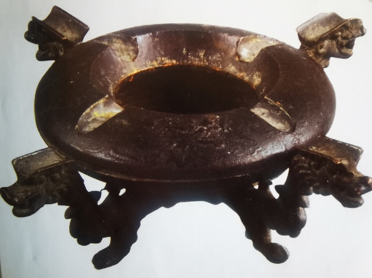 此具煙缸為圓形,有足,黃銅材質(zhì)。四條龍的四只龍足撐起了整個煙缸。龍足向上延伸出四個龍首,龍首頂上各擎一個內(nèi)凹的小長方形,好似龍兒皆戴著一頂博士帽。內(nèi)凹朝向缸沿面,也有四個對應(yīng)的凹陷,雖是煙缸之用,一具煙缸八面凹陷,還是較罕見的,應(yīng)有八面玲瓏之寓意吧。缸沿上蓋是可以拆卸的,便于清潔缸底。四條龍神態(tài)威武,龍首后脖頸處,龍鱗凹凸有致,一層復(fù)一層,披肩似的羽鱗片若隱若現(xiàn),感覺它們正用力撐起煙缸而帶動了鱗片。龍兒嘴巴微微張開,原來它們都含著一顆龍珠呢!